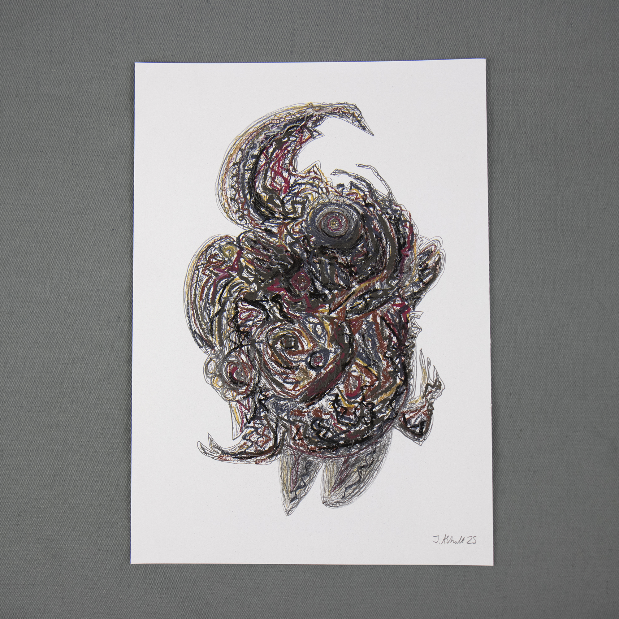 Originalt abstrakt kunstværk skabt med kridt, oliepastel og blyant på 250 gram syrefrit papir.