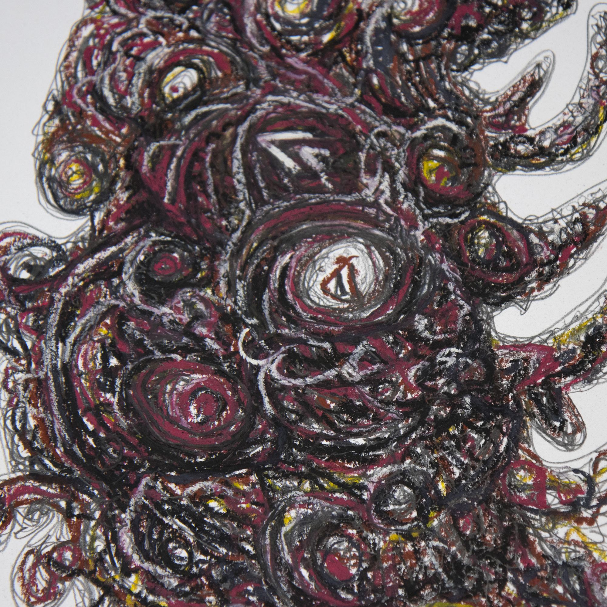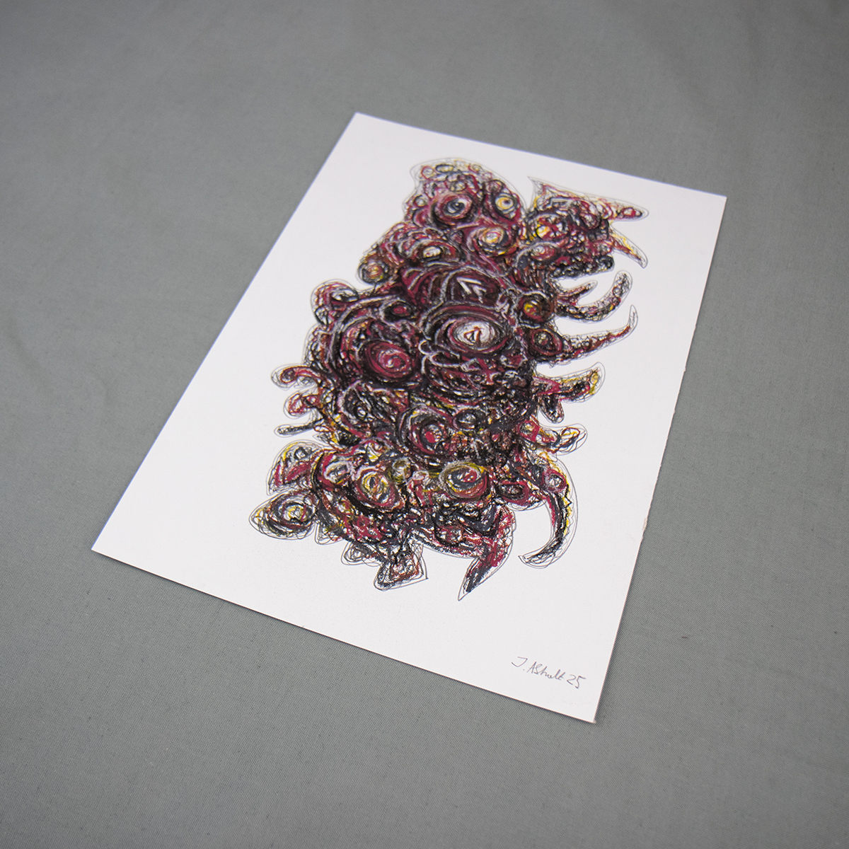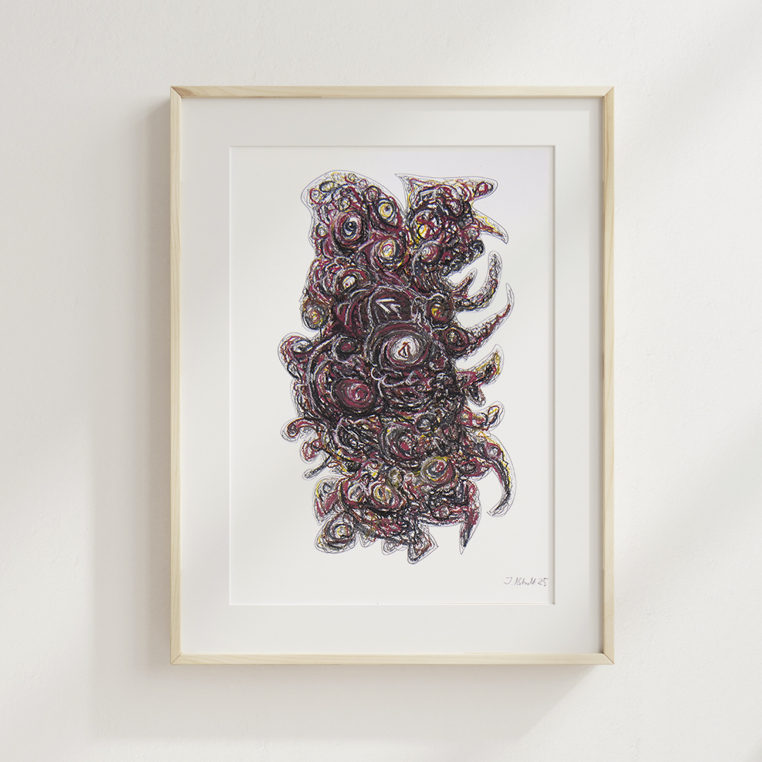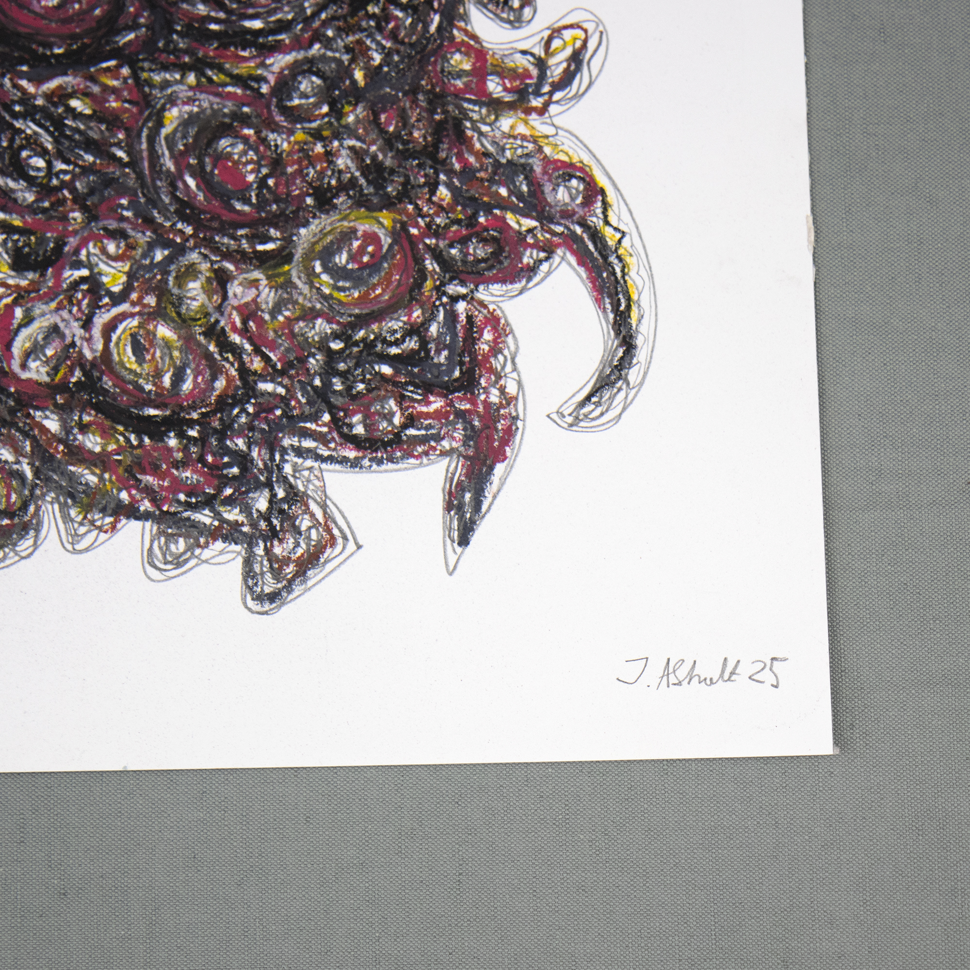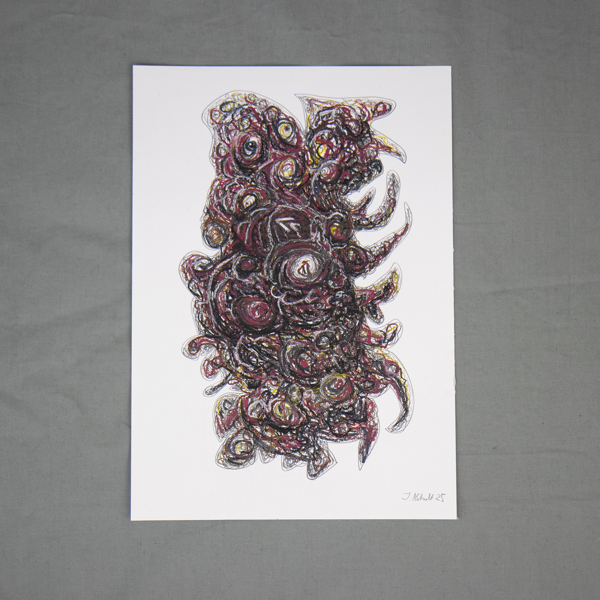 Originalt abstrakt kunstværk skabt med kridt, oliepastel og blyant på 250 gram syrefrit papir.